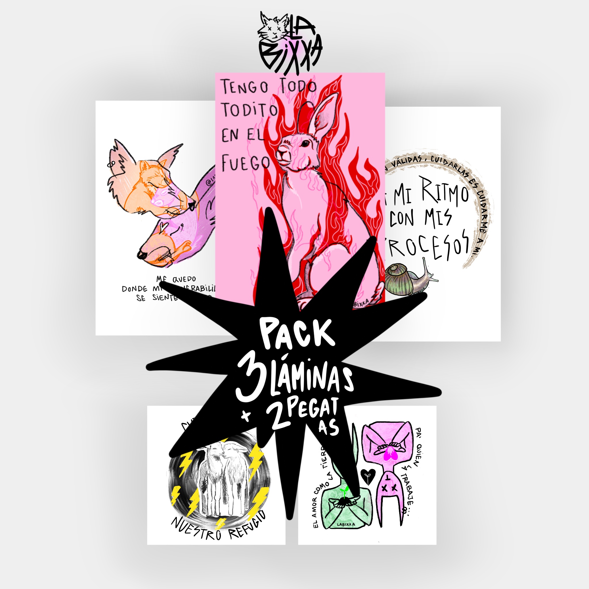 | Láminas | Cierva, Conexión telepática, Cuidarnos es nuestro refugio, Hogar es donde están mis amigas, Nos acompañamos, Procesos Caracol, Responsabilidad afectiva, Sororidad interespecie, Suavidad Radikal, Vulnerable k no débil, A más presión…, A veces esta intensidad…, Abrazo mis miedos, Además de tristeza…, Arriba el descanso, Bosque en llamas, Construir desde la incertidumbre, Desobediencia y apoyo mutuo, Donde hay refugios…, El amor como la tierra, El enfado me protege, Esta intensidad, Fugar(nos), Haz caso al cuerpo, Hogar es quien lo habita, Las garras afiladas, Las heridas del territorio, Llevo conmigo todos los lugares…., Lo que soy es suficiente, Los cuidados no se teorizan…, Luchar por otros mundos posibles, Me agradezco, Me quedo donde mi vulnerabilidad…, No sé, habito la extrañeza, Okupa la ternura, Protejo mi suavidad, PunkiCuki, Que me ruge en las entrañas, Sacar la rabia, Sin miedo, Todo en el fuego, Volar y volver |